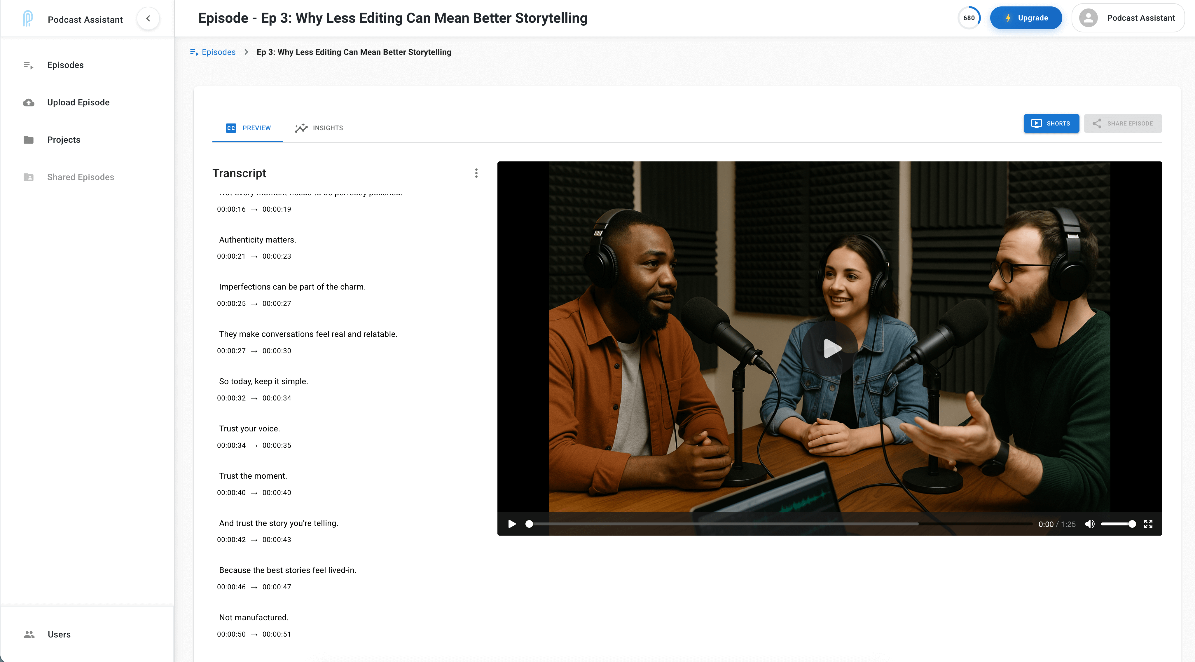 Our advanced system analyzes your episode, generates transcripts, creates chapters, identifies highlights, shorts videos and prepares everything for platform upload.